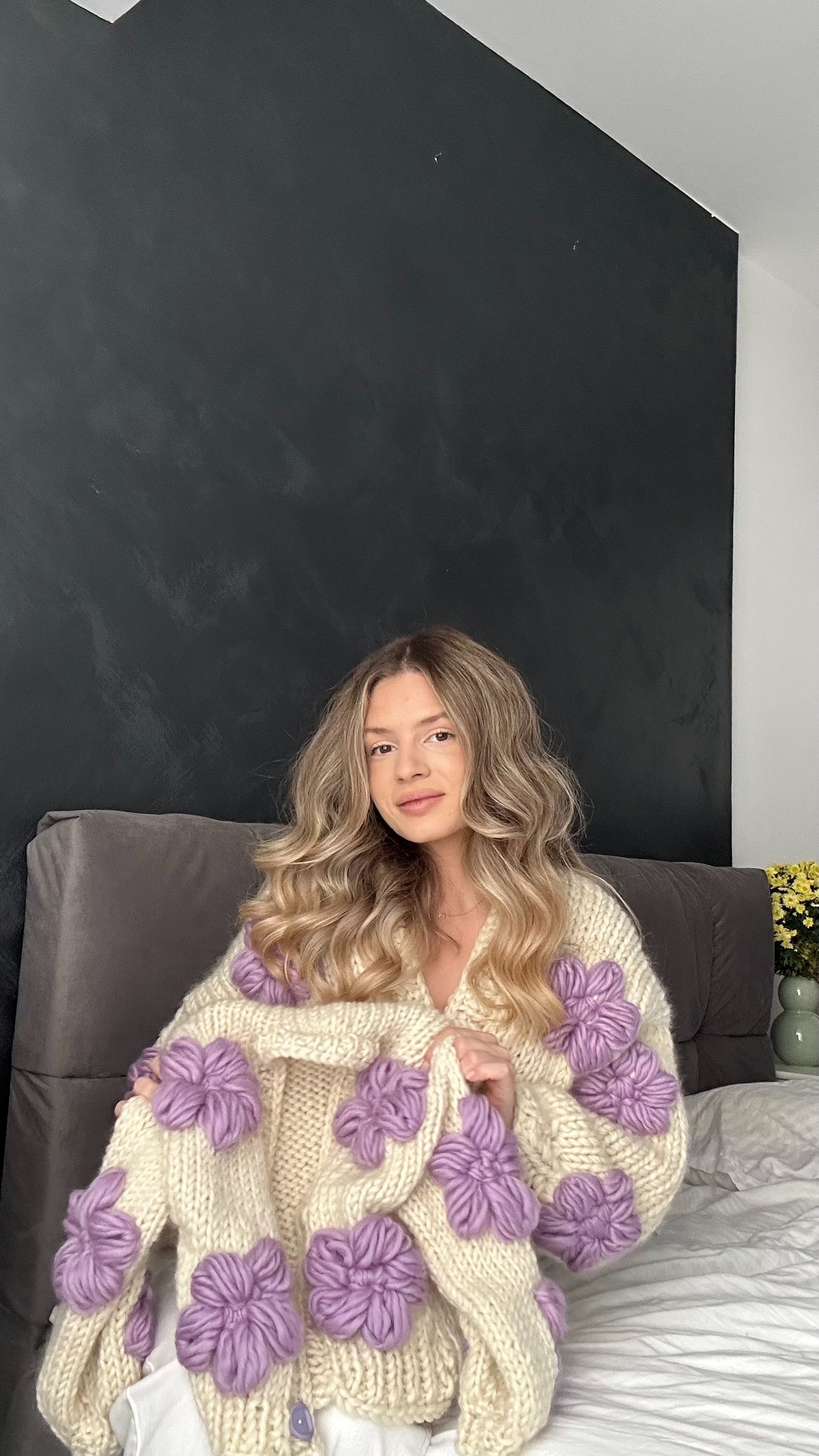 Cozy up in style with our chunky handmade merino wool cardigan, featuring bold 3D floral appliqués for a unique statement. Hand-knitted with ultra-soft, premium merino wool, this oversized cardigan offers warmth, comfort, and a chic, modern aesthetic.